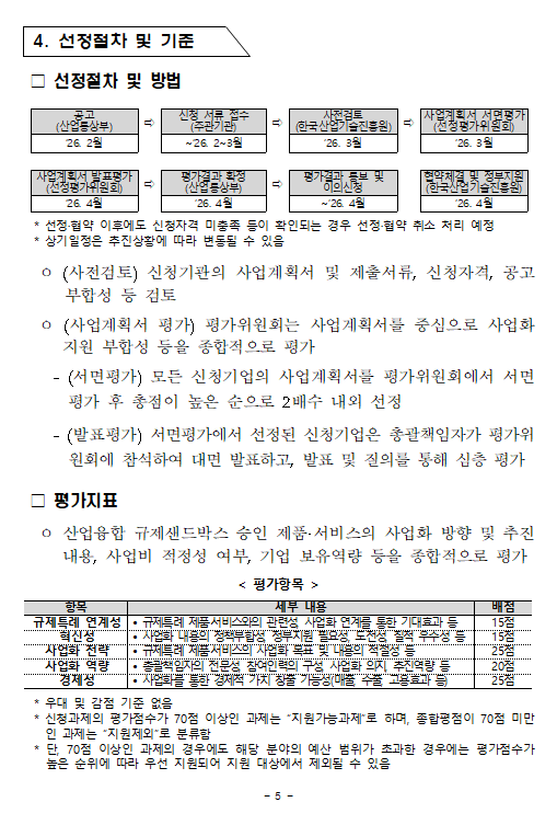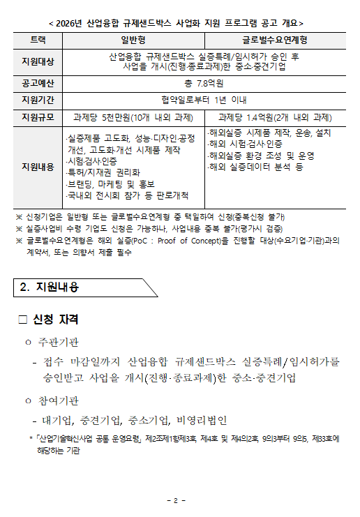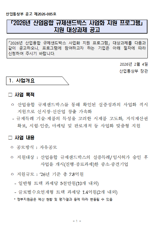 [사업모집]2026 산업융합 규제샌드박스 사업화 지원 프로그램 지원 대상과제 공고